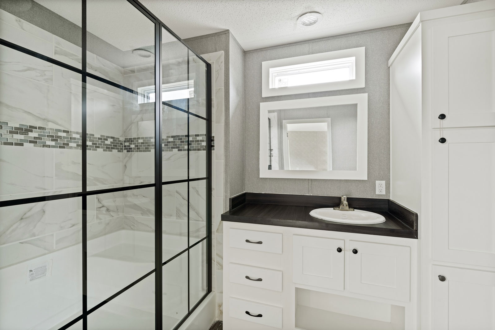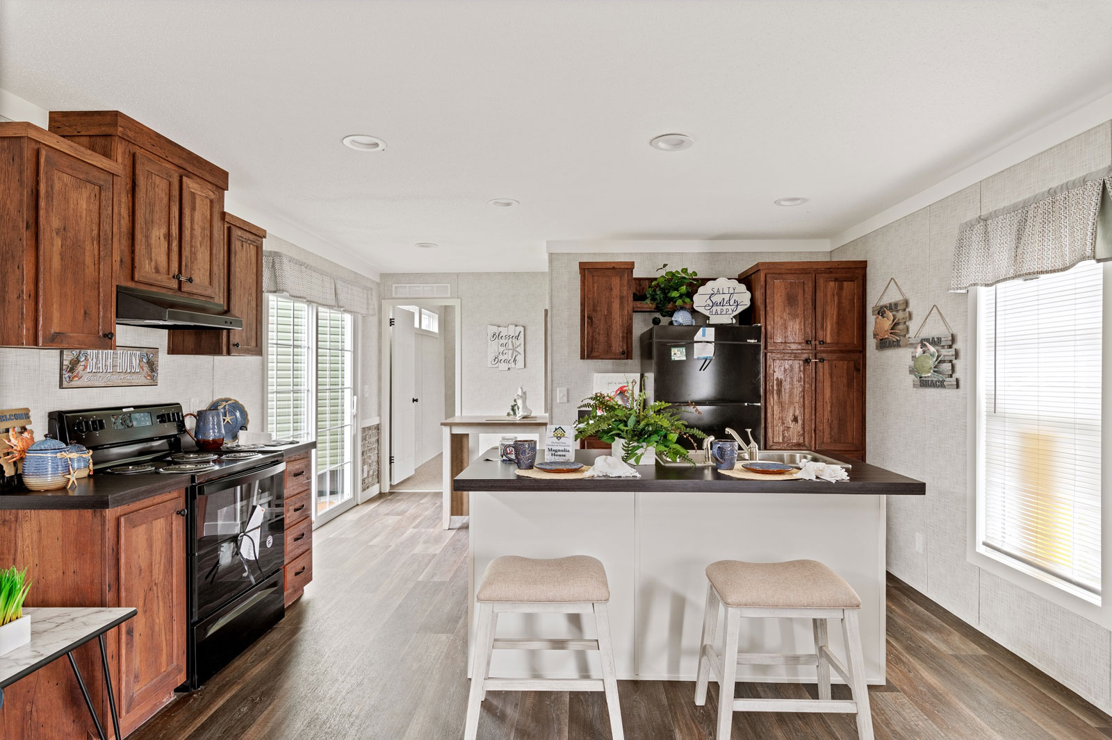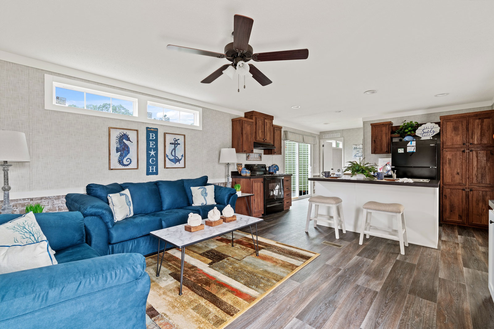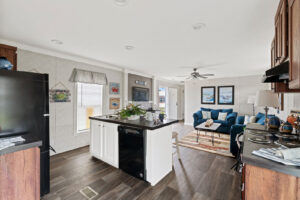 A Floor Plan Drenched in Detail While many homes in this class feel basic, the Brunswick feels custom. The 2-Bedroom, 2-Bathroom layout is anchored by a stunning 12’10” x 14’2” Living Room featuring a floating entertainment center and feature wall that instantly elevates the space. The kitchen is a chef’s delight with a large island and a massive 6-door pantry. The dining area is flooded with light thanks to the sliding patio door. The Master Suite is a true retreat, distinguishing itself with a 60x42 tile shower and a 3-door linen closet—luxury features rarely found in homes of this size.